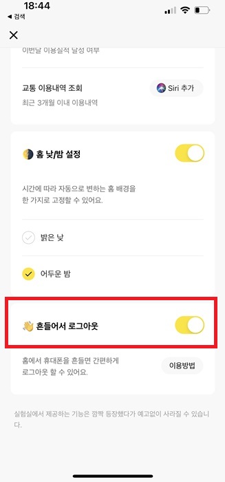 3. 이후 흔들어서 로그아웃 토글을 왼쪽에서 오른쪽으로 클릭해서 노란색 표시가 보이도록 설정합니다.