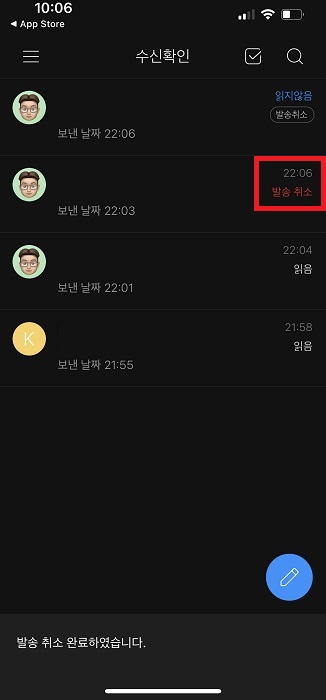2. 이후 아직 읽지않은 메일이 있다면 발송취소 버튼을 볼수가 있으며 클릭을 합니다.