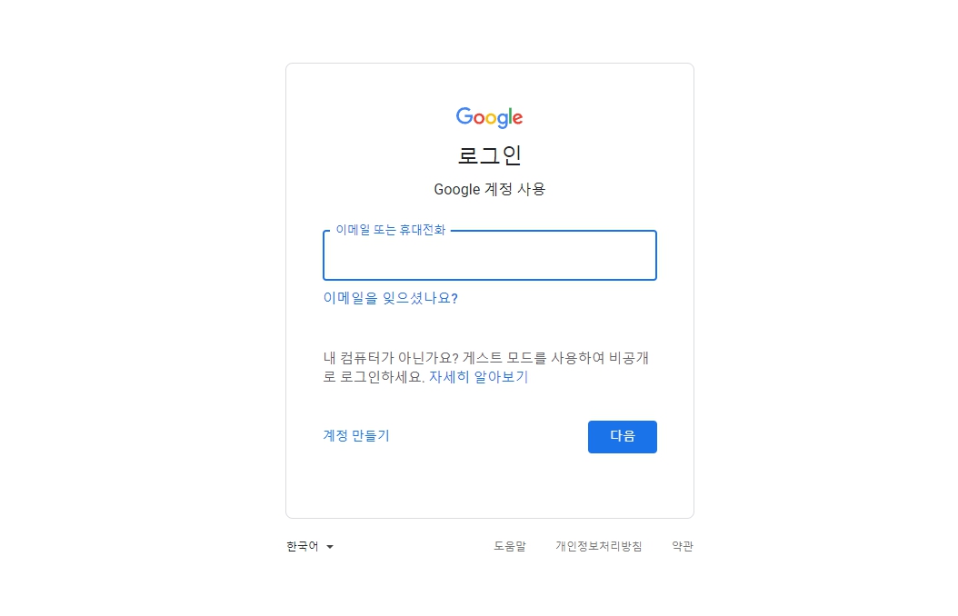 1. 지메일 로그인 화면으로 이동하여 복구해야 하는 계정 아이디를 입력합니다.
