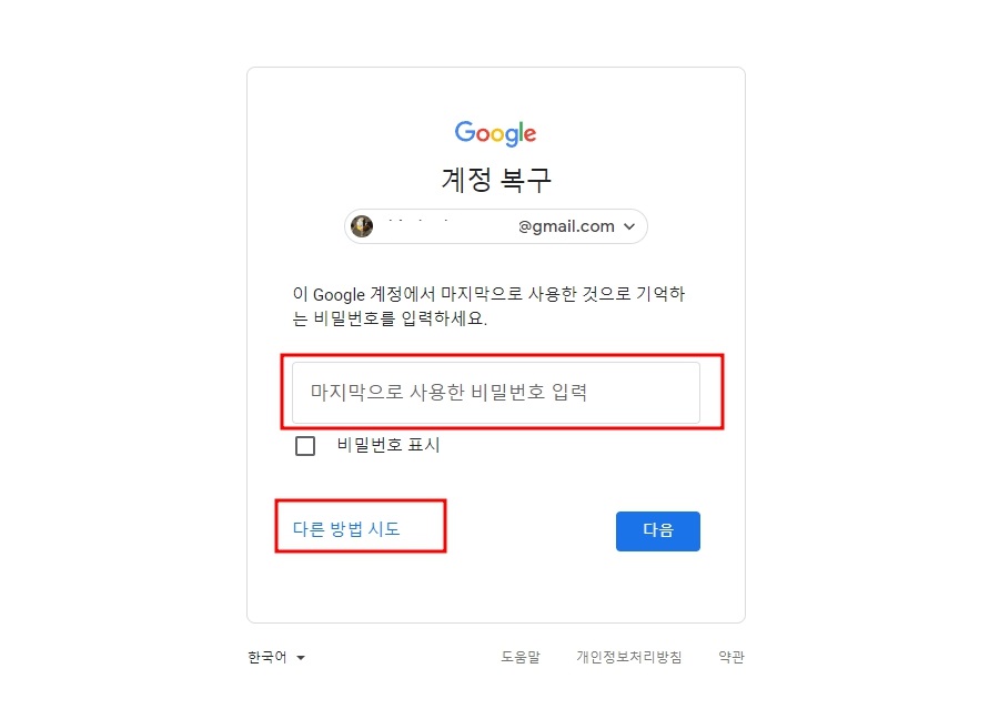 4. 그게 아니라면 마지막으로 사용한 비밀번호를 입력합니다. 마지막으로 사용한 비밀번호도 기억이 나지 않는다면 다른 방법 시도 버튼을 클릭합니다.