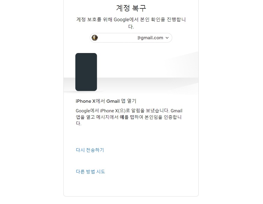3. 휴대전화에 연결된 지메일이라면 해당 휴대전화로 알람이 전송이 되면서 지메일 앱을 열고 메시지에서 예를 탭하여 본인임을 인증하면 됩니다. 해당 폰이 아니라면 다른 방법 시도 버튼을 클릭합니다.