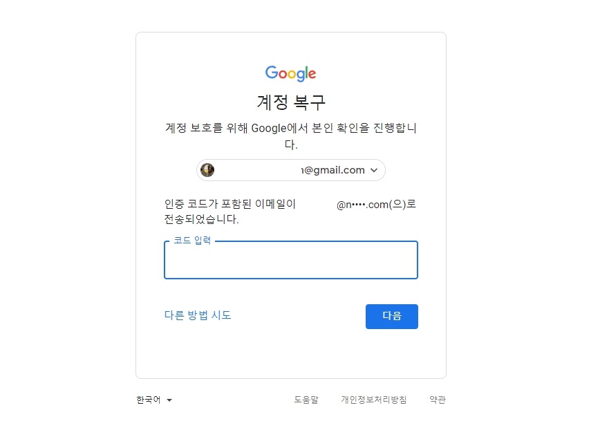 5. 다음 지메일 비밀번호 찾기에서는 복구 이메일로 인증코드가 전송이 되며 해당 인증코드를 입력합니다. 그게 아니라면 다른 방법 시도 버튼을 클릭합니다.