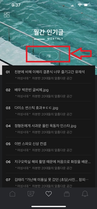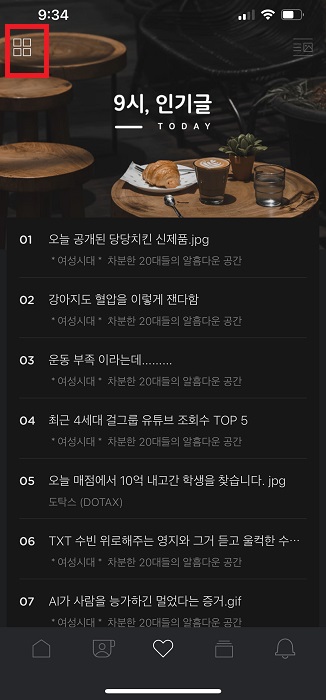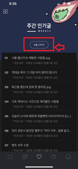 2. 그리고 나서 하단에 하트 모양의 아이콘을 클릭합니다. 그러면 현재 9시의 경우 9시 인기글을 볼수가 있습니다.