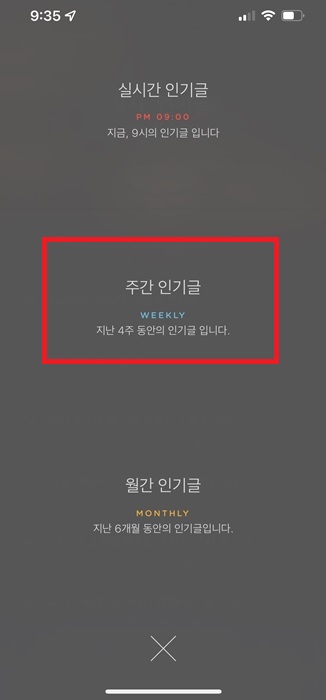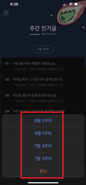 4. 그리고 주간 인기글을 클릭해주세요. 그러면 현재 주차의 글을 볼수가 있습니다.