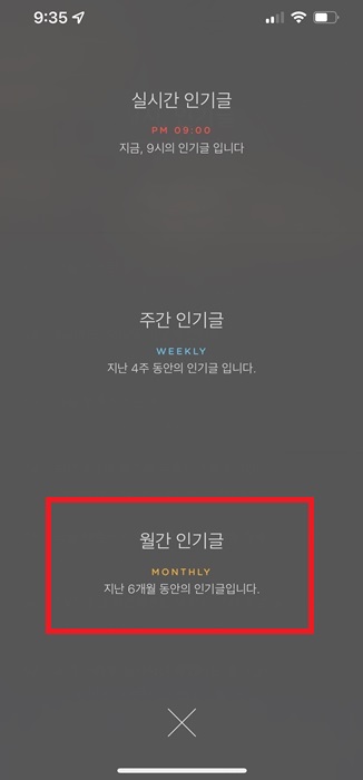 5. 또한 월간 인기글로 최대 지난 6개월 동안의 인기글을 볼수가 있습니다. 네모 박스를 클릭하고 월간 인기글을 클릭합니다.